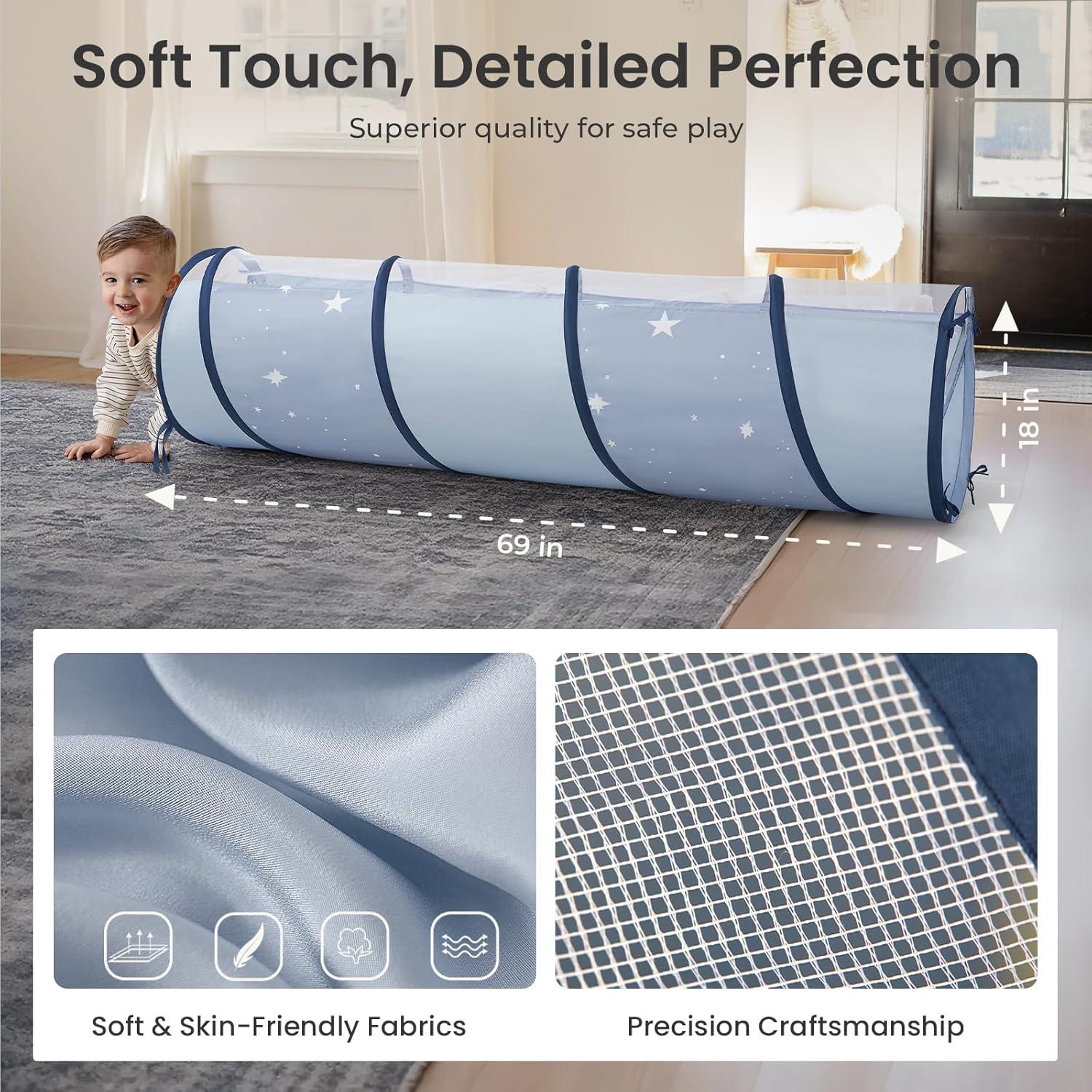 Breathable & Durable Fabric – Our play tunnel is made from a peach skin fabric that is so soft and comfortable! The breathable mesh on the sides enhances airflow and ventilation, ensuring that children will not feel stuffy during long playtime. Tiny Land play tunnel is ASTM-certified and rigorously tested for child safety, giving parents peace of mind while their little ones explore and play!
