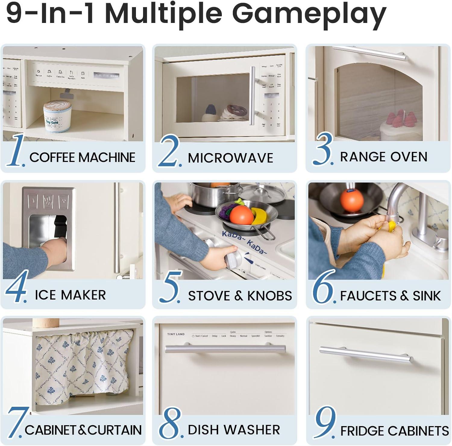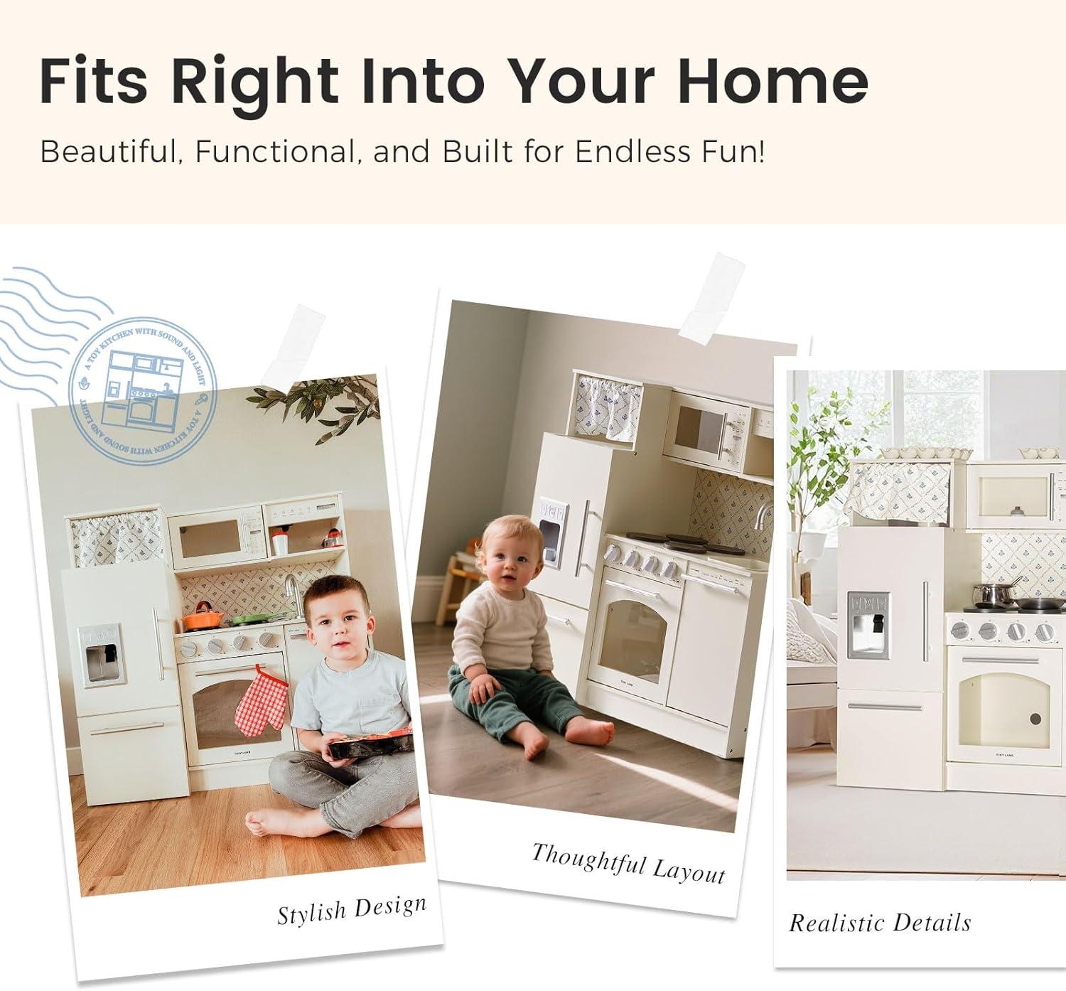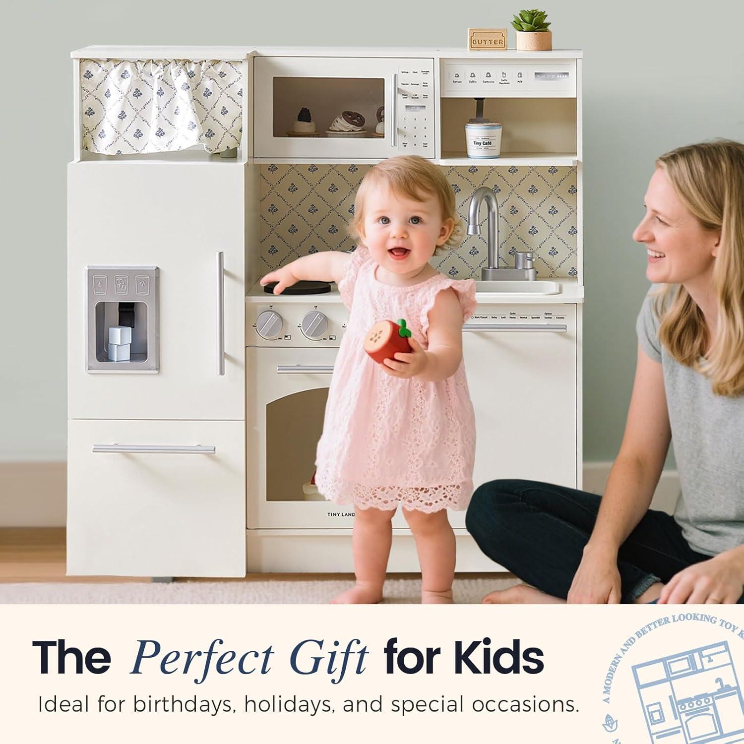 Tiny Land Play Kitchen for Kids, Upgraded Wooden Kitchen Toy with Complete Play Areas, Pretend Cooking Set with Sink, Stove, Microwave, Toy Coffee Station & Storage for Kids Ages 3+(White)