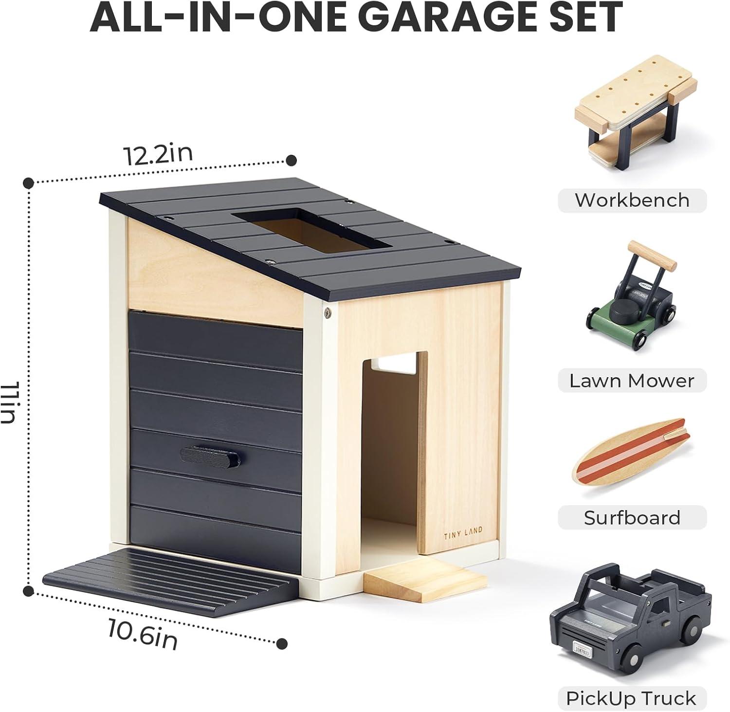 Realistic Wooden Dollhouse Garage Set – Finely crafted wooden garage playset featuring a detailed garage, workbench, toy lawn mower, and SUV car. Specially designed to fit Tiny Land dollhouses while also compatible with most other dollhouses, making it a versatile addition to any dollhouse furniture and dollhouse accessories collection.